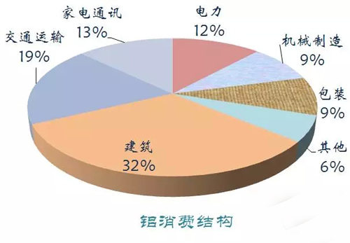 鋁主要應(yīng)用于建筑、交通運(yùn)輸、家電通訊、電力、包裝和機(jī)械制造等領(lǐng)域。2014年我國鋁土礦儲(chǔ)量3250萬噸,產(chǎn)量2330萬噸,原鋁消費(fèi)量2406萬噸。