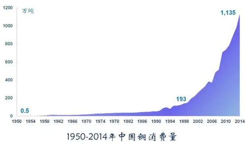 鋼鐵用量約占金屬消費(fèi)的75%,是工業(yè)的骨骼。鋼鐵是工業(yè)化過程中最重要的原材料之一,2014年中國消費(fèi)鋼鐵7.44億噸,是建國時(shí)的1240倍。
